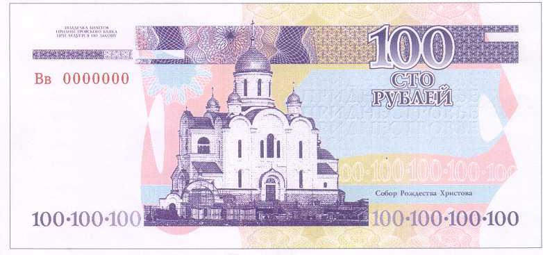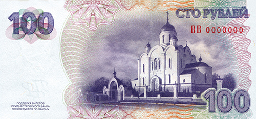ОПИСАНИЕ ОБОРОТНОЙ СТОРОНЫ: В центре изображение Собора Рождества Христова в г. Тирасполь. Справа вверху расположена надпись “СТО РУБЛЕЙ”, под ней - серия и семизначный номер, выполненные высоким способом печати люминесцирующей краской. Справа внизу - крупное число “100”. Слева вверху на чистом поле также расположено крупное число “100” и многотоновый водяной знак (портрет Румянцева-Задунайского П. А.), под ним высококонтрастный филигранный водяной знак “ПРБ”.
