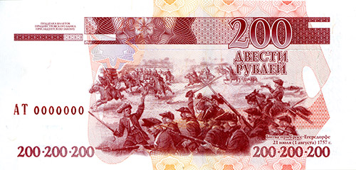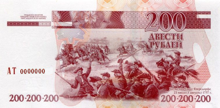 В центре – гравюра с изображением битвы при Гросс-Егерсдорфе в 1757 г., в правом нижнем углу гравюры – надпись «Битва при Гросс-Егерсдорфе 21 июля (1 августа) 1757 г.». Слева над орнаментной полосой – текст «ПОДДЕЛКА БИЛЕТОВ ПРИДНЕСТРОВСКОГО БАНКА ПРЕСЛЕДУЕТСЯ ПО ЗАКОНУ», в центре под орнаментной полосой – серия из двух заглавных букв и семизначный номер, выполненные высоким способом печати красно-коричневой краской. Справа вверху – цифровое обозначение номинала «200», под ним – надпись «ДВЕСТИ РУБЛЕЙ». Справа и слева внизу – горизонтальный ряд трижды повторяющегося цифрового обозначения номинала «200».