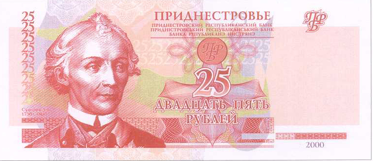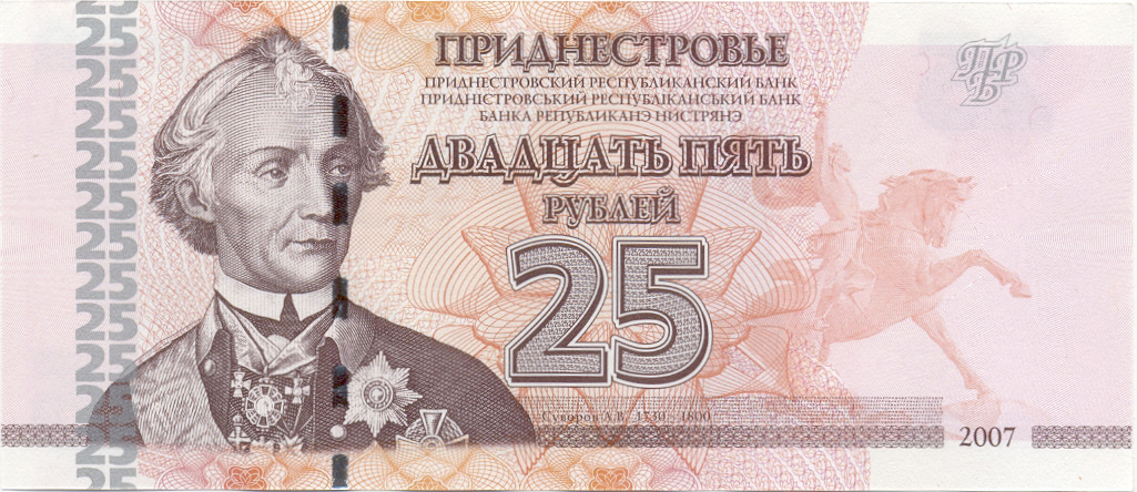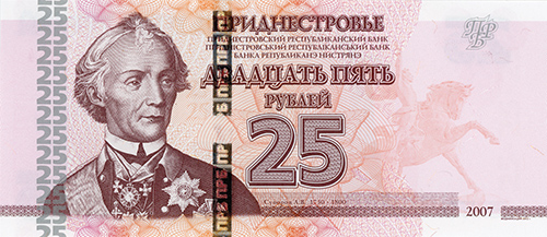 ОПИСАНИЕ ЛИЦЕВОЙ СТОРОНЫ: Вверху - надпись “ПРИДНЕСТРОВЬЕ”, под надписью мелким шрифтом на трёх языках текст “ПРИДНЕСТРОВСКИЙ РЕСПУБЛИКАНСКИЙ БАНК”. В центре - обозначение номинала - “ДВАДЦАТЬ ПЯТЬ РУБЛЕЙ”, ниже - цифровое обозначение номинала - “25”. Внизу в центре микротекст контурный “ПРИДНЕСТРОВЬЕ”. Слева - портрет А. В. Суворова выполнен в стиле ручной гравюры, слева от неё полосовой элемент в виде повторяющегося номинала (25). Справа - на чистом поле вверху расположен текст “ПРБ”, внизу между орнаментными полосами отпечатан розовым цветом год образца банкноты - “2007”. Многотоновый водяной знак (портрет Екатерины II), под ним высококонтрастный филигранный водяной знак “ПРБ”.