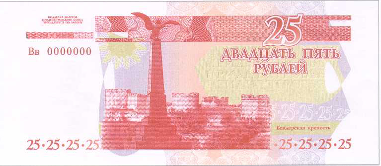 В центре – коллаж изображение Бендерской крепости. Слева вверху на чистом поле – крупная цифра «25», внизу – текст «ПОДДЕЛКА БИЛЕТОВ ПРИДНЕСТРОВСКОГО БАНКА ПРЕСЛЕДУЕТСЯ ПО ЗАКОНУ». Справа вверху – надпись «ДВАДЦАТЬ ПЯТЬ РУБЛЕЙ», под ней – серия из двух заглавных букв и семизначный номер, внизу – крупная цифра «25».