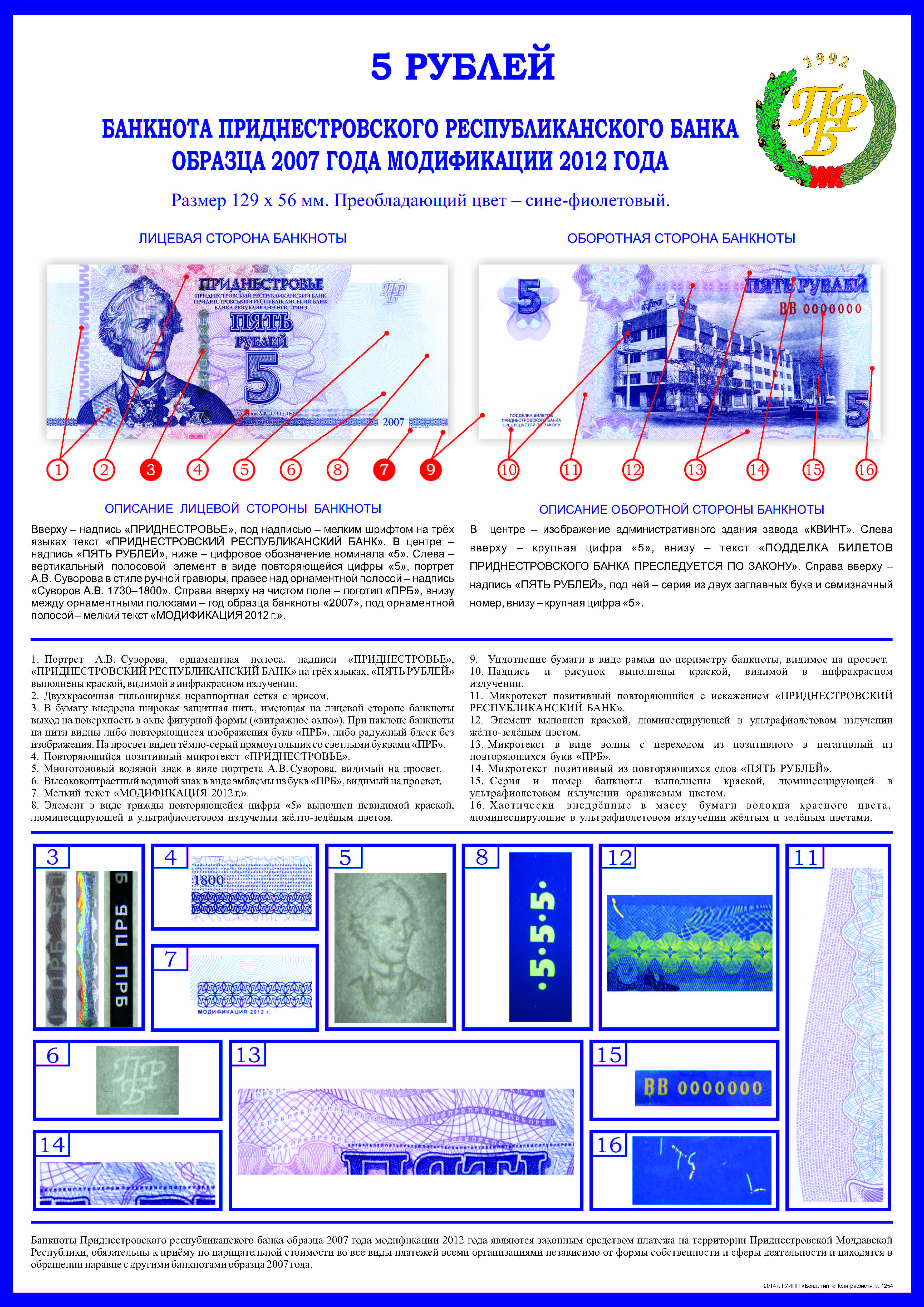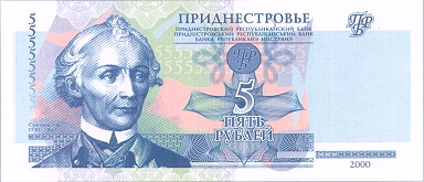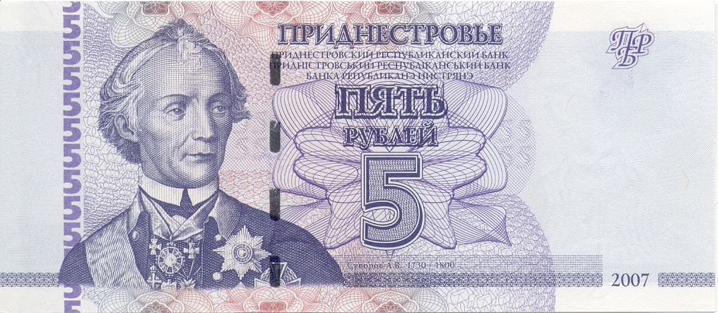ОПИСАНИЕ ЛИЦЕВОЙ СТОРОНЫ: Вверху - надпись “ПРИДНЕСТРОВЬЕ”, под надписью мелким шрифтом на трёх языках текст “ПРИДНЕСТРОВСКИЙ РЕСПУБЛИКАНСКИЙ БАНК”. В центре - обозначение номинала - “ПЯТЬ РУБЛЕЙ”, ниже - цифровое обозначение номинала - “5”. Внизу в центре микротекст контурный “ПРИДНЕСТРОВЬЕ”. Слева - портрет А. В. Суворова выполнен в стиле ручной гравюры, слева от неё полосовой элемент в виде повторяющегося номинала (5). Справа - на чистом поле вверху расположен текст “ПРБ”, внизу между орнаментными полосами отпечатан фиолетовым цветом год образца банкноты - “2007”. Многотоновый водяной знак (портрет А. В. Суворова), под ним высококонтрастный филигранный водяной знак “ПРБ”.