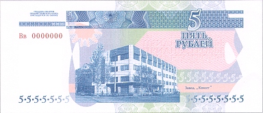ОПИСАНИЕ ОБОРОТНОЙ СТОРОНЫ: В центре изображение административного здания завода “КВИНТ”. Справа вверху расположена надпись “ПЯТЬ РУБЛЕЙ”, под ней - серия и семизначный номер, выполненные высоким способом печати люминесцирующей краской. Справа внизу - крупное число “5”. Слева вверху на чистом поле также расположено крупное число “5” и многотоновый водяной знак (портрет А. В. Суворова), под ним высококонтрастный филигранный водяной знак “ПРБ”.