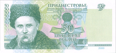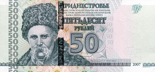 ОПИСАНИЕ ЛИЦЕВОЙ СТОРОНЫ: Вверху - надпись “ПРИДНЕСТРОВЬЕ”, под надписью мелким шрифтом на трёх языках текст “ПРИДНЕСТРОВСКИЙ РЕСПУБЛИКАНСКИЙ БАНК”. В центре - обозначение номинала - “ПЯТЬДЕСЯТ РУБЛЕЙ”, ниже - цифровое обозначение номинала - “50”. Внизу в центре микротекст контурный “ПРИДНЕСТРОВЬЕ”. Слева - портрет Т. Г. Шевченко выполнен в стиле ручной гравюры, слева от неё полосовой элемент в виде повторяющегося номинала (50). Справа - на чистом поле вверху расположен текст “ПРБ”, внизу между орнаментными полосами отпечатан зелёным цветом год образца банкноты - “2007”. Многотоновый водяной знак (портрет Румянцева-Задунайского П. А.), под ним высококонтрастный филигранный водяной знак “ПРБ”.