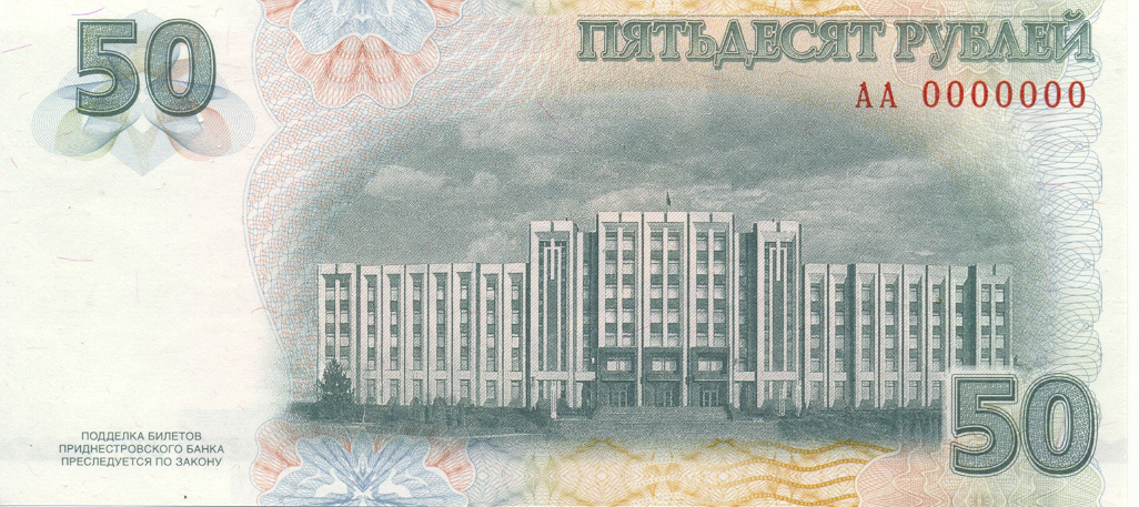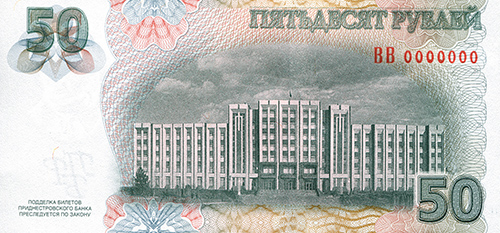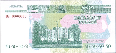 ОПИСАНИЕ ОБОРОТНОЙ СТОРОНЫ: В центре изображение Дома Верховного Совета и Правительства ПМР. Справа вверху расположена надпись “ПЯТЬДЕСЯТ РУБЛЕЙ”, под ней - серия и семизначный номер, выполненные высоким способом печати люминесцирующей краской. Справа внизу - крупное число “50”. Слева вверху на чистом поле также расположено крупное число “50” и многотоновый водяной знак (портрет Румянцева-Задунайского П. А.), под ним высококонтрастный филигранный водяной знак “ПРБ”.