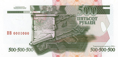 В центре – изображение плана Тираспольской крепости и Указа российской императрицы Екатерины II о ее создании, выполненное в виде ручной гравюры, в правом нижнем углу изображения – надпись «Тираспольская крепость 1826 г.». Слева вверху над орнаментной полосой – текст «ПОДДЕЛКА БИЛЕТОВ ПРИДНЕСТРОВСКОГО БАНКА ПРЕСЛЕДУЕТСЯ ПО ЗАКОНУ», ниже – серия из двух заглавных букв и семизначный номер. Справа вверху – крупная цифра «500», под ней – надпись «ПЯТЬСОТ РУБЛЕЙ». Справа и слева внизу – горизонтальный ряд трижды повторяющегося цифрового обозначения номинала «500».