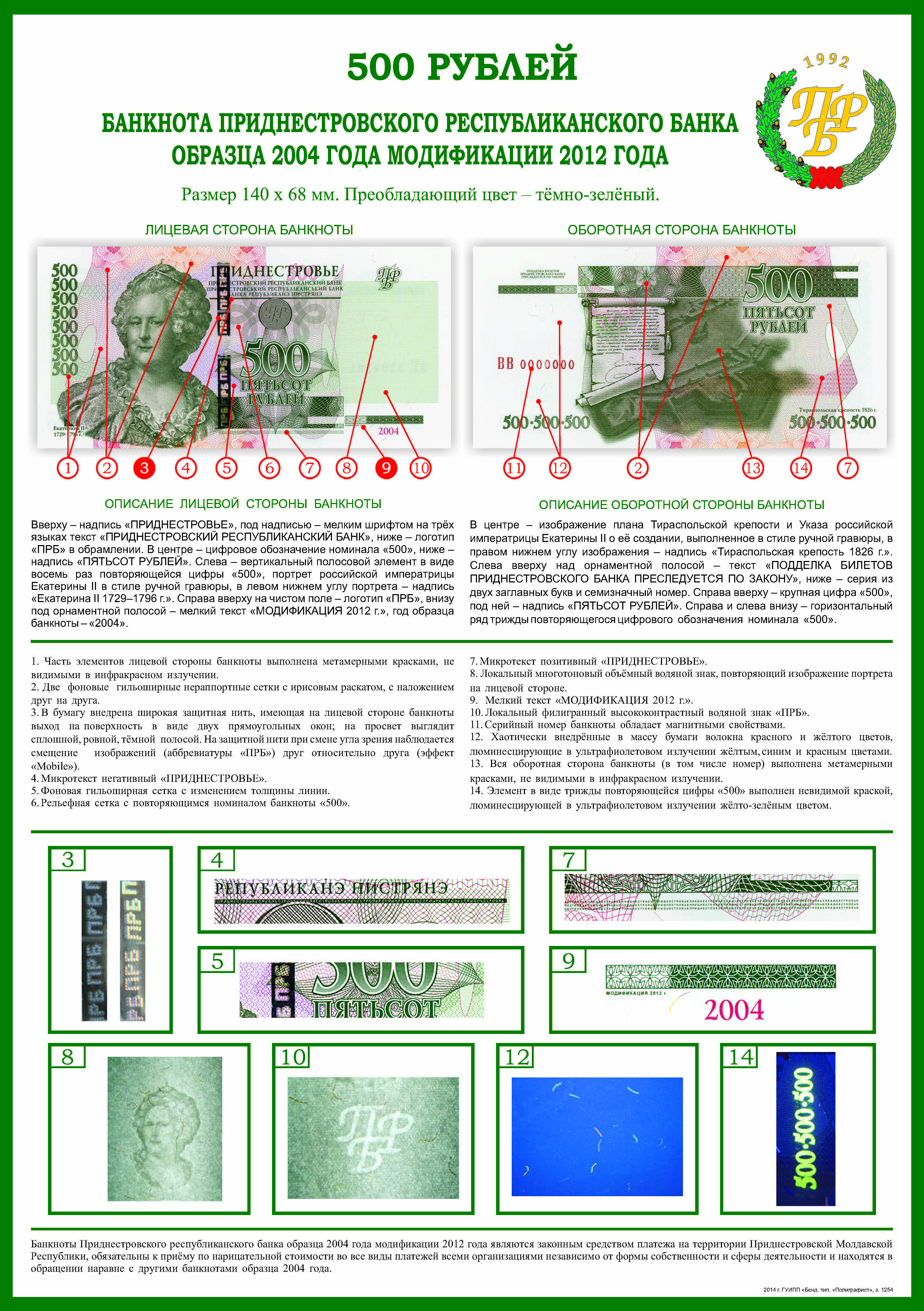 500 рублей образца 2004 г. модификации 2012 г. - постер с описанием и степенями защиты.