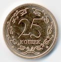 На оборотной стороне монеты номиналом 25 копеек: отчеканен номинал монет – “25”, обрамленный стилизованным лавровым венком. Под номиналом расположена надпись “КОПЕЕК”.