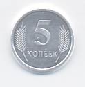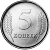На оборотной стороне монеты номиналом 5 копеек: в центре отчеканена цифра "5", обрамленная колосьями пшеницы. Под номиналом расположена надпись "КОПЕЕК".
