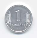 На оборотной стороне монеты номиналом 1 копейка: в центре отчеканена цифра "1", обрамленная колосьями пшеницы. Под номиналом расположена надпись "КОПЕЙКА".