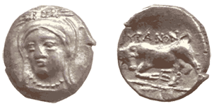 Наряду с истрийскими драхмами в этот же период имели хождение медные, серебряные и золотые монеты другого греческого полиса - Тиры, основанного милетцами на западном берегу Днестровского лимана в черте современного города Белгорода-Днестровского. С IV в. до н. э. Тира приобрела значение торгового центра, обладающего всеми структурами городского самоуправления, что подтверждает чеканка городской монеты. На лицевой стороне серебряных драхм Тиры изображена Деметра, на оборотной – бык (рис. 2).