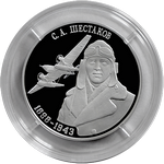 в центре – портрет заслуженного военного лётчика СССР С.А. Шестакова в лётном шлеме и зимней форме; слева – изображение самолёта; вверху – надпись «С.А. ШЕСТАКОВ»; внизу – годы жизни «1898-1943».