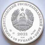 в центре – изображение Государственного герба Приднестровской Молдавской Республики; по кругу – надписи: вверху «ПРИДНЕСТРОВСКИЙ РЕСПУБЛИКАНСКИЙ БАНК», внизу – «10 РУБЛЕЙ»; в нижней части под гербом – год выпуска монеты «2021», ниже – содержание химически чистого металла в граммах, слева – логотип изготовителя, государственное пробирное клеймо, справа – обозначение металла, проба сплава.