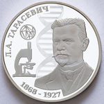 в центре – портрет микробиолога Л.А. Тарасевича на фоне стилизованного изображения цепи ДНК и микроскопа, вверху – надпись «Л.А. ТАРАСЕВИЧ», внизу – годы жизни «1868-1927».