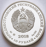 в центре – изображение Государственного герба Приднестровской Молдавской Республики; по кругу – надписи: вверху – «ПРИДНЕСТРОВСКИЙ РЕСПУБЛИКАНСКИЙ БАНК», внизу – «10 РУБЛЕЙ»; в нижней части под гербом – год выпуска монеты «2018», слева – логотип изготовителя, государственное пробирное клеймо, справа – обозначение металла, проба сплава.