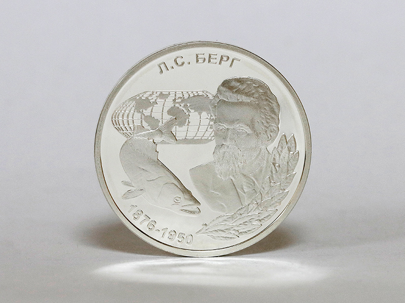 в центре – портрет географа Л.С. Берга, обрамлённый снизу справа лавровым венком; слева от портрета – композиция из стилизованной географической карты и изображения пресноводной рыбы – судака. По кругу – надписи: вверху – «Л.С. БЕРГ», внизу – годы жизни: «1876-1950».