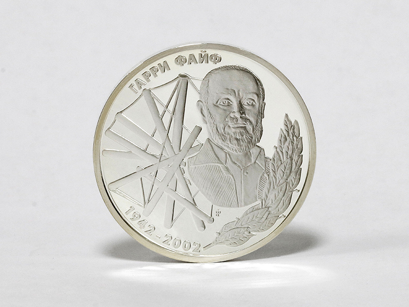 в центре – портрет архитектора Гарри Файфермахера на фоне скульптуры «Мир»; вверху слева направо – надпись: «ГАРРИ ФАЙФ»; внизу – годы жизни: «1942-2002», справа – лавровая ветвь.