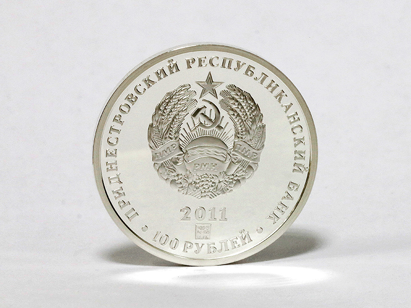 в центре – изображение Государственного герба Приднестровской Молдавской Республики; по кругу – надписи: вверху – «ПРИДНЕСТРОВСКИЙ РЕСПУБЛИКАНСКИЙ БАНК», внизу – «100 РУБЛЕЙ»; в нижней части под гербом – год выпуска монеты «2011», ниже – логотип изготовителя, государственное пробирное клеймо, обозначение металла, проба сплава, содержание химически чистого металла в граммах.
