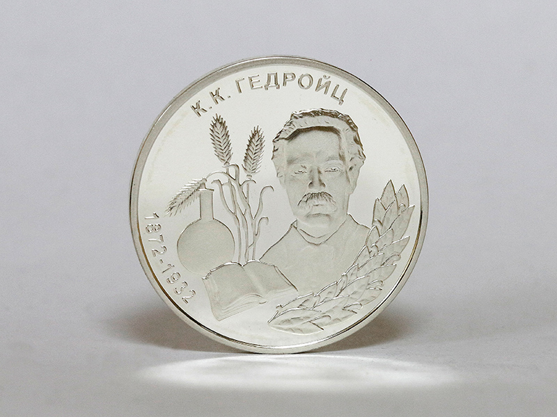 в центре – портрет академика К.К. Гедройца, обрамлённый снизу справа лавровым венком; слева от портрета – композиция из трёх колосьев, химической колбы и раскрытой книги. По кругу – надписи: вверху – «К.К. ГЕДРОЙЦ», слева – годы жизни: «1872-1932».