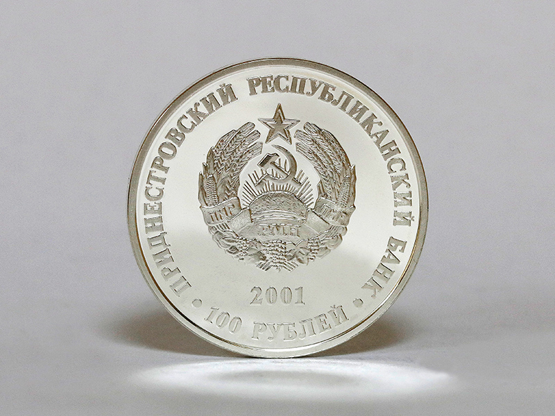 в центре – изображение Государственного герба Приднестровской Молдавской Республики; по кругу – надписи: вверху – «ПРИДНЕСТРОВСКИЙ РЕСПУБЛИКАНСКИЙ БАНК», внизу – «100 РУБЛЕЙ»; в нижней части под гербом – год выпуска монеты «2001».