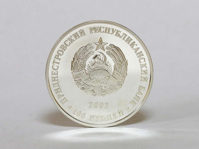 в центре – изображение Государственного герба Приднестровской Молдавской Республики; по кругу – надписи: вверху – «ПРИДНЕСТРОВСКИЙ РЕСПУБЛИКАНСКИЙ БАНК», внизу – «100 РУБЛЕЙ»; в нижней части под гербом – год выпуска монеты «2002».