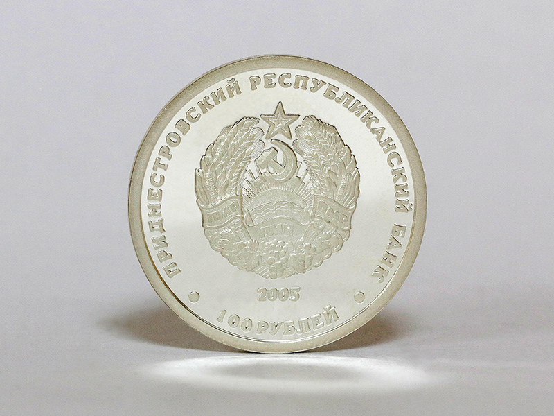 в центре – изображение Государственного герба Приднестровской Молдавской Республики; по кругу – надписи: вверху – «ПРИДНЕСТРОВСКИЙ РЕСПУБЛИКАНСКИЙ БАНК», внизу – «100 РУБЛЕЙ»; в нижней части под гербом – год выпуска монеты «2005».
