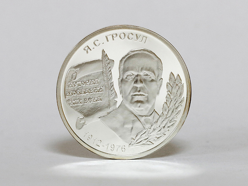 в центре – портрет академика Я.С. Гросула, обрамлённый справа лавровым венком; слева от портрета – композиция из развёрнутого свитка пергамента и вертикально стоящего пера, на свитке – надпись: «ИСТОРИЯ МОЛДАВИИ XIX ВЕКА». По кругу – надписи: вверху – «Я.С. ГРОСУЛ», внизу – годы жизни: «1912-1976».