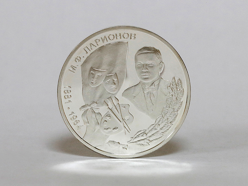 в центре – портрет художника М.Ф. Ларионова, обрамлённый снизу справа лавровым венком; слева от портрета – композиция из театральной кулисы и стилизованных театральных масок, ниже – композиция из палитры с тремя кистями и тюбиком краски. По кругу – надписи: вверху – «М.Ф. ЛАРИОНОВ», слева – годы жизни: «1881-1964».
