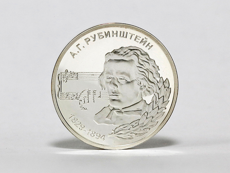 в центре – портрет композитора А.Г. Рубинштейна, обрамлённый справа лавровым венком; слева от портрета – начальные ноты музыкального произведения «Баркарола». По кругу – надписи: вверху – «А.Г. РУБИНШТЕЙН», внизу – годы жизни: «1829-1894».
