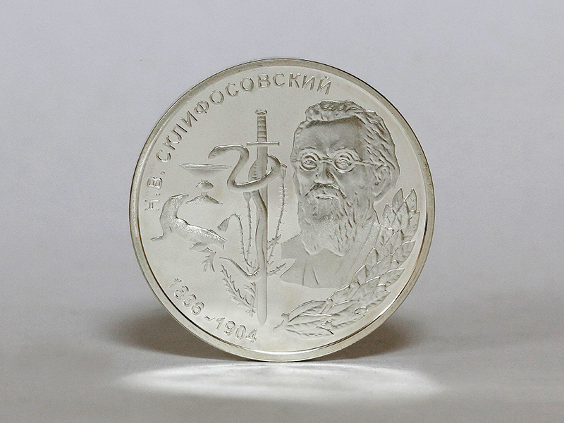 в центре – портрет хирурга Н.В. Склифосовского, обрамлённый снизу справа лавровым венком; слева от портрета – композиция из ужа, обвившего лезвие меча на фоне растения с шипами и склоняющегося над чашей, ниже которой – изображение ящерицы с усеченным хвостом. По кругу – надписи: вверху – «Н.В. СКЛИФОСОВСКИЙ», внизу – годы жизни: «1836-1904».