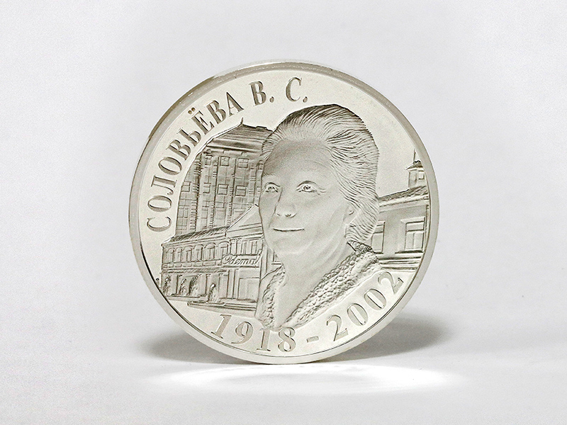 в центре – портрет Героя Социалистического труда В.С. Соловьёвой на фоне производственных корпусов ЗАО «Одема» им. В.С. Соловьёвой; слева вверху – надпись: «СОЛОВЬЁВА В.С.»; внизу – годы жизни: «1918-2002».