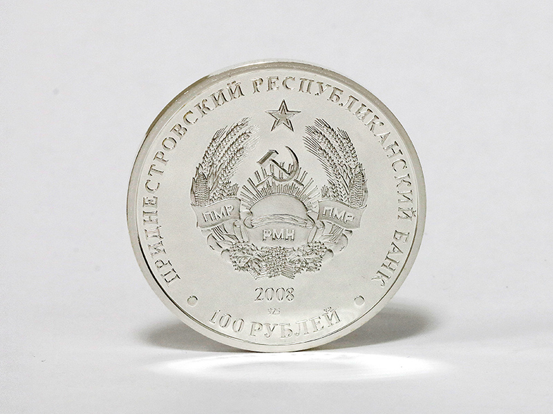 в центре – изображение Государственного герба Приднестровской Молдавской Республики; по кругу – надписи: вверху – «ПРИДНЕСТРОВСКИЙ РЕСПУБЛИКАНСКИЙ БАНК», внизу – «100 РУБЛЕЙ»; в нижней части под гербом – год выпуска монеты «2008», ниже – проба сплава.