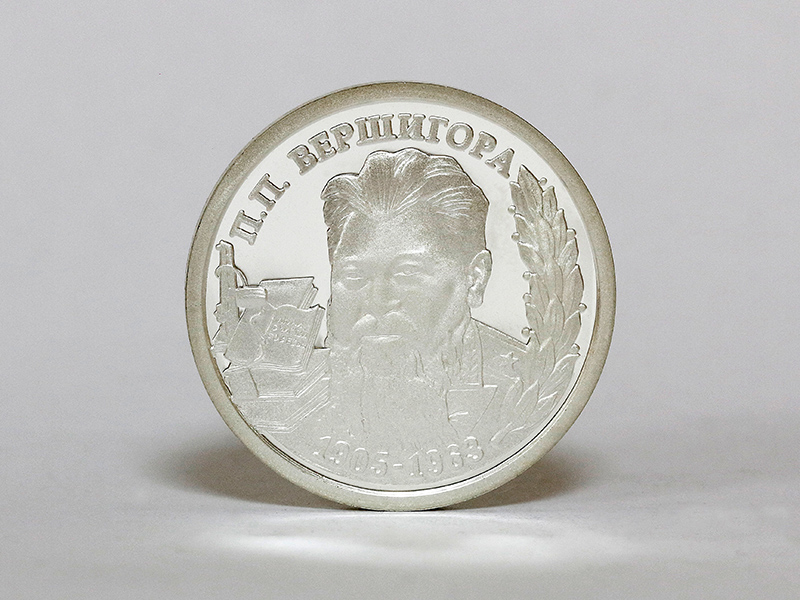 в центре – портрет писателя П.П. Вершигоры, обрамлённый справа лавровым венком; слева от портрета – композиция из стопки книг и автомата. Верхняя книга из стопки раскрыта, на листе читается текст: «ЛЮДИ С ЧИСТОЙ СОВЕСТЬЮ». По кругу – надписи: вверху – «П.П. ВЕРШИГОРА», внизу – годы жизни: «1905-1963».
