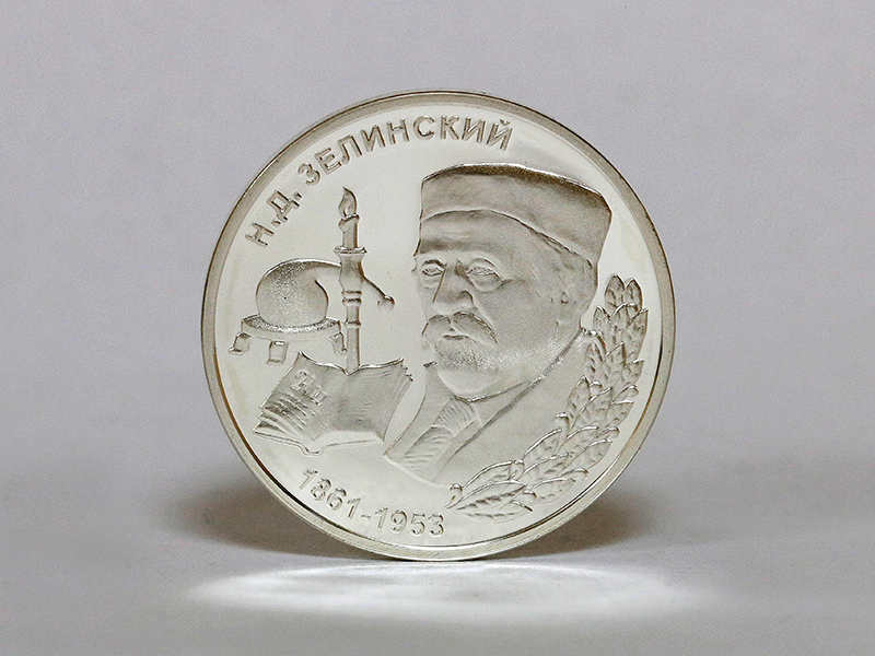 в центре – портрет химика Н.Д. Зелинского, обрамлённый снизу справа лавровым венком; слева от портрета – композиция из реторты на подставке, горящей свечи и раскрытой книги с химическим обозначением золота (Au) на странице. По кругу – надписи: вверху – «Н.Д. ЗЕЛИНСКИЙ», внизу – годы жизни: «1861-1953».