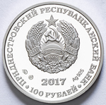 в центре – изображение Государственного герба Приднестровской Молдавской Республики; по кругу – надписи: вверху – «ПРИДНЕСТРОВСКИЙ РЕСПУБЛИКАНСКИЙ БАНК», внизу – «100 РУБЛЕЙ»; в нижней части под гербом – год выпуска монеты «2017», слева – логотип изготовителя, государственное пробирное клеймо, справа – обозначение металла, проба сплава.