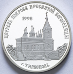 в центре – изображение Церкви Покрова Пресвятой Богородицы, над ним надпись «1998»; по кругу – надписи: вверху – «ЦЕРКОВЬ ПОКРОВА ПРЕСВЯТОЙ БОГОРОДИЦЫ», внизу – «г. ТИРАСПОЛЬ».