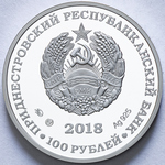 в центре – изображение Государственного герба Приднестровской Молдавской Республики; по кругу – надписи: вверху – «ПРИДНЕСТРОВСКИЙ РЕСПУБЛИКАНСКИЙ БАНК», внизу – «100 РУБЛЕЙ»; в нижней части под гербом – год выпуска монеты «2018», слева – логотип изготовителя, государственное пробирное клеймо, справа – обозначение металла, проба сплава.