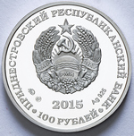 в центре – изображение Государственного герба Приднестровской Молдавской Республики; по кругу – надписи: вверху – «ПРИДНЕСТРОВСКИЙ РЕСПУБЛИКАНСКИЙ БАНК», внизу – «100 РУБЛЕЙ»; в нижней части под гербом – год выпуска монеты «2015», слева – логотип изготовителя, государственное пробирное клеймо, справа – обозначение металла, проба сплава.