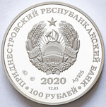 в центре – изображение Государственного герба Приднестровской Молдавской Республики; по кругу – надписи: вверху – «ПРИДНЕСТРОВСКИЙ РЕСПУБЛИКАНСКИЙ БАНК», внизу – «100 РУБЛЕЙ»; в нижней части под гербом – год выпуска монеты «2020», ниже – содержание химически чистого металла в граммах, слева – логотип изготовителя, государственное пробирное клеймо, справа – обозначение металла, проба сплава.