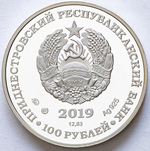 в центре – изображение Государственного герба Приднестровской Молдавской Республики; по кругу – надписи: вверху – «ПРИДНЕСТРОВСКИЙ РЕСПУБЛИКАНСКИЙ БАНК», внизу – «100 РУБЛЕЙ»; в нижней части под гербом – год выпуска монеты «2019», ниже – содержание химически чистого металла в граммах, слева – логотип изготовителя, государственное пробирное клеймо, справа – обозначение металла, проба сплава.