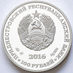 в центре – изображение Государственного герба Приднестровской Молдавской Республики; по кругу – надписи: вверху – «ПРИДНЕСТРОВСКИЙ РЕСПУБЛИКАНСКИЙ БАНК», внизу – «100 РУБЛЕЙ»; в нижней части под гербом – год выпуска монеты «2016», слева – логотип изготовителя, государственное пробирное клеймо, справа – обозначение металла, проба сплава.