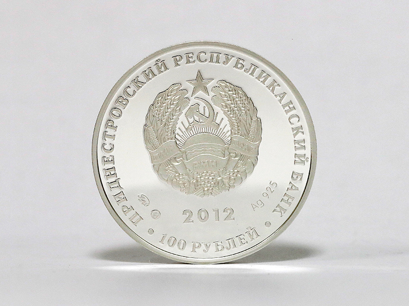 в центре – изображение Государственного герба Приднестровской Молдавской Республики; по кругу – надписи: вверху – «ПРИДНЕСТРОВСКИЙ РЕСПУБЛИКАНСКИЙ БАНК», внизу – «100 РУБЛЕЙ»; в нижней части под гербом – год выпуска монеты «2012», слева – логотип изготовителя, государственное пробирное клеймо, справа – обозначение металла, проба сплава.