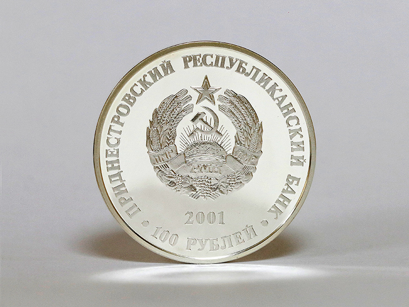 в центре – изображение Государственного герба Приднестровской Молдавской Республики; по кругу – надписи: вверху – «ПРИДНЕСТРОВСКИЙ РЕСПУБЛИКАНСКИЙ БАНК», внизу – «100 РУБЛЕЙ»; в нижней части под гербом – год выпуска монеты «2001».