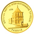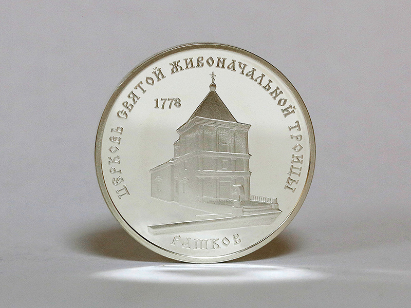 в центре – изображение церкви Святой Живоначальной Троицы, над ним – надпись: «1778»; по кругу – надписи: вверху – «ЦЕРКОВЬ СВЯТОЙ ЖИВОНАЧАЛЬНОЙ ТРОИЦЫ», внизу – «РАШКОВ».