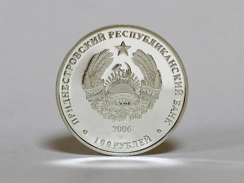 в центре – изображение Государственного герба Приднестровской Молдавской Республики; по кругу – надписи: вверху – «ПРИДНЕСТРОВСКИЙ РЕСПУБЛИКАНСКИЙ БАНК», внизу – «100 РУБЛЕЙ»; в нижней части под гербом – год выпуска монеты «2006», ниже – проба сплава.