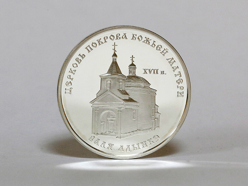 в центре – изображение церкви Покрова Божьей Матери, над ним – надпись: «XVII в.»; по кругу – надписи: вверху – «ЦЕРКОВЬ ПОКРОВА БОЖЬЕЙ МАТЕРИ», внизу – «ВАЛЯ-АДЫНКЭ».