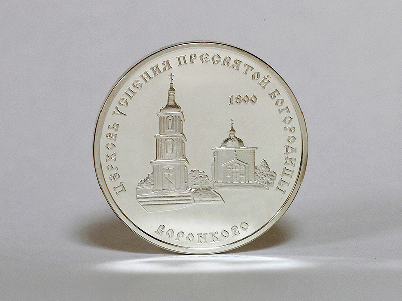 в центре – изображение церкви Успения Пресвятой Борогодицы, над ним – надпись: «1800»; по кругу – надписи: вверху – «ЦЕРКОВЬ УСПЕНИЯ ПРЕСВЯТОЙ БОГОРОДИЦЫ», внизу – «ВОРОНКОВО».