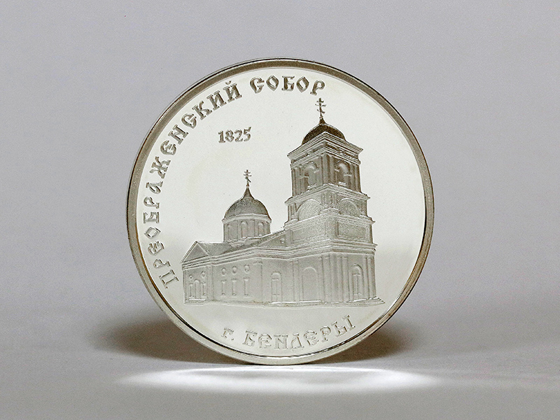 в центре – изображение Преображенского собора, над ним – надпись: «1825»; по кругу – надписи: вверху слева направо – «ПРЕОБРАЖЕНСКИЙ СОБОР», внизу по центру – «г. БЕНДЕРЫ».