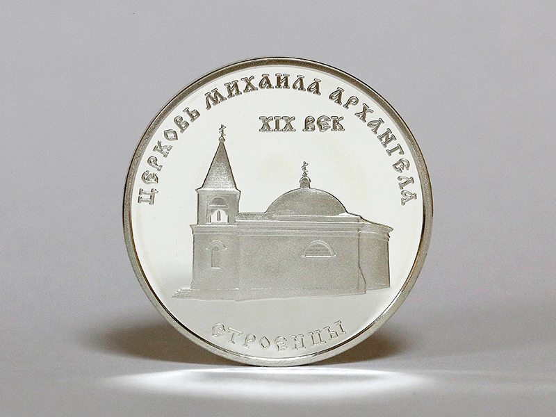 в центре – изображение церкви Михаила Архангела, над ним – надпись: «XIX ВЕК»; по кругу – надписи: вверху – «ЦЕРКОВЬ МИХАИЛА АРХАНГЕЛА», внизу – «СТРОЕНЦЫ».