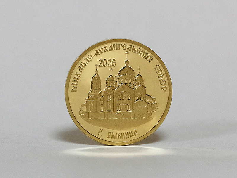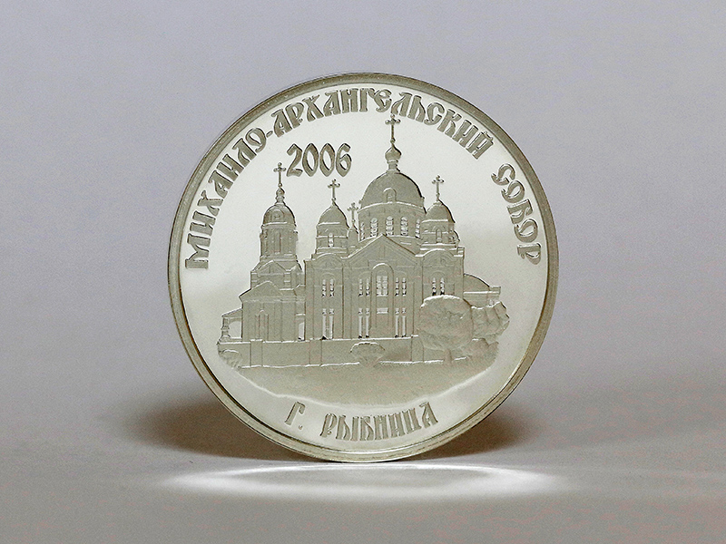в центре – изображение Михаило-Архангельского собора, над ним – надпись: «2006»; по кругу – надписи: вверху – «МИХАИЛО-АРХАНГЕЛЬСКИЙ СОБОР», внизу – «Г. РЫБНИЦА».