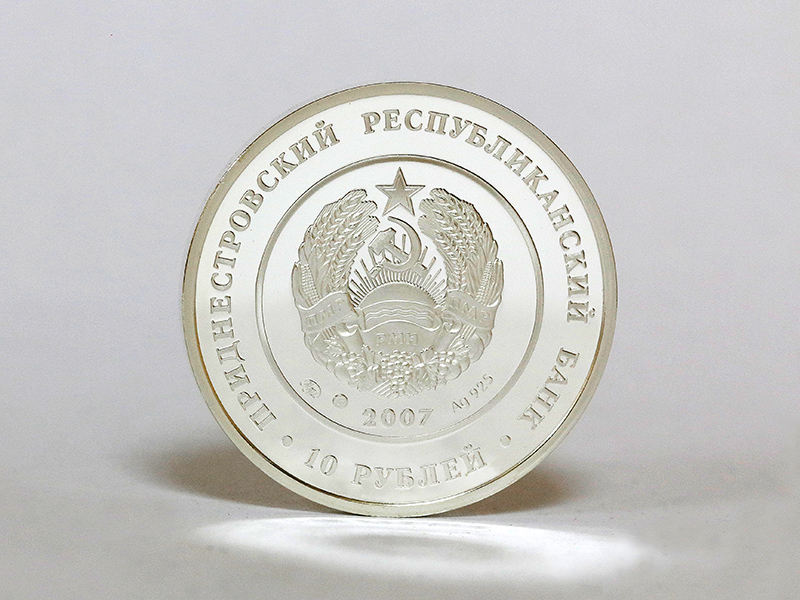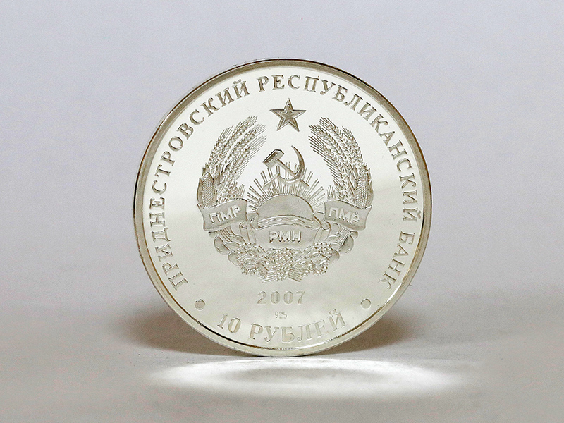 в центре – изображение Государственного герба Приднестровской Молдавской Республики; по кругу – надписи: вверху – «ПРИДНЕСТРОВСКИЙ РЕСПУБЛИКАНСКИЙ БАНК», внизу – «10 РУБЛЕЙ». В нижней части под гербом – год выпуска монеты «2007», слева – логотип изготовителя, государственное пробирное клеймо, справа – обозначение металла, проба сплава.
